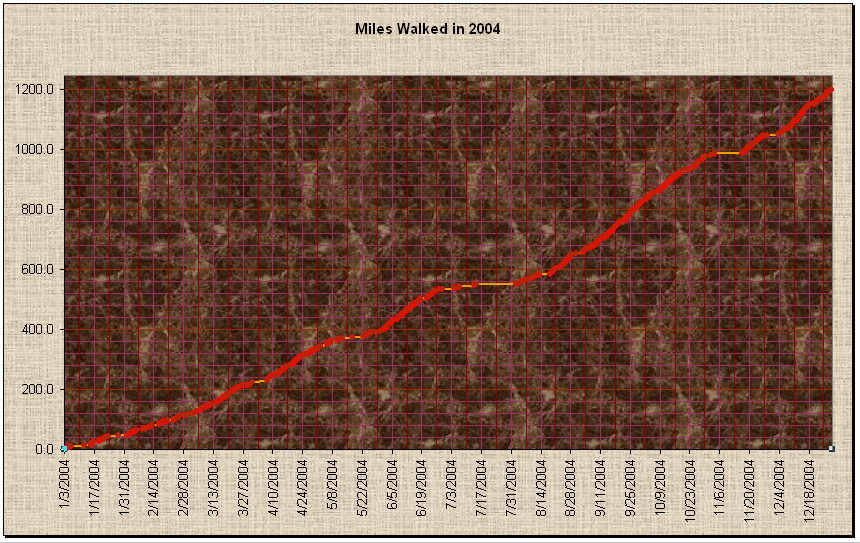 Later in the year I decided to set my goal for 1200 miles in 2004. In order to be on track for that goal, I needed to average about 3.28 miles per day. In January I averaged 1.46. That was less than half of what I needed, but at least I was walking. I should have hit 45.2 miles, which ended up being my total for the month, on January 14, and so that left me 17 days behind schedule on January 31.
