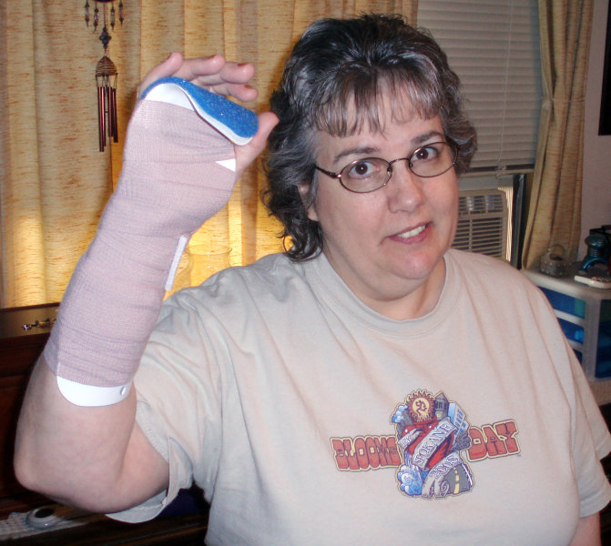 Once I got her home, I could see early on that Dotti was not going to be a good patient, because she was limping around and picking things up, etc., and clearly in no mood for sitting around waiting to get better. I felt that it was fortunate that they were putting a cast on, or else she would be trying do far more with that hand than she should.