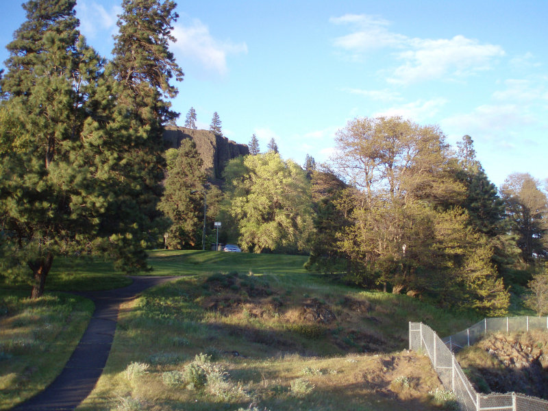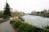 Like the bow of a ship, Inspiration Point splits the Spokane River. You can just see the couple behind the shrubbery all the way out on the point. Notice the well maintained sidewalk, rock wall, and vegetation.