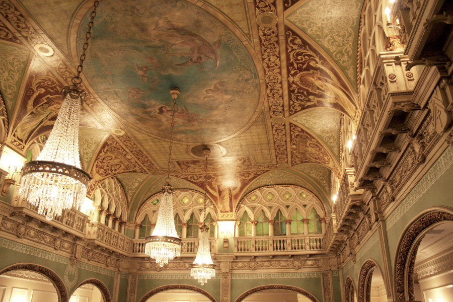 From the second floor, and looking down, you can see the same spot where we were standing for the previous picture, just to the right of the perpetually burning fireplace. The entire room is art, from the ornate lampposts, the walls, the furniture, and even, no, especially the ceiling. For over 90 years people have come to be impressed by this lovely hotel, and even though many years have come and gone since it first opened its doors, the Davenport Hotel really does have a very similar plush feel, like the one that ms Westerdam had on our cruise together.