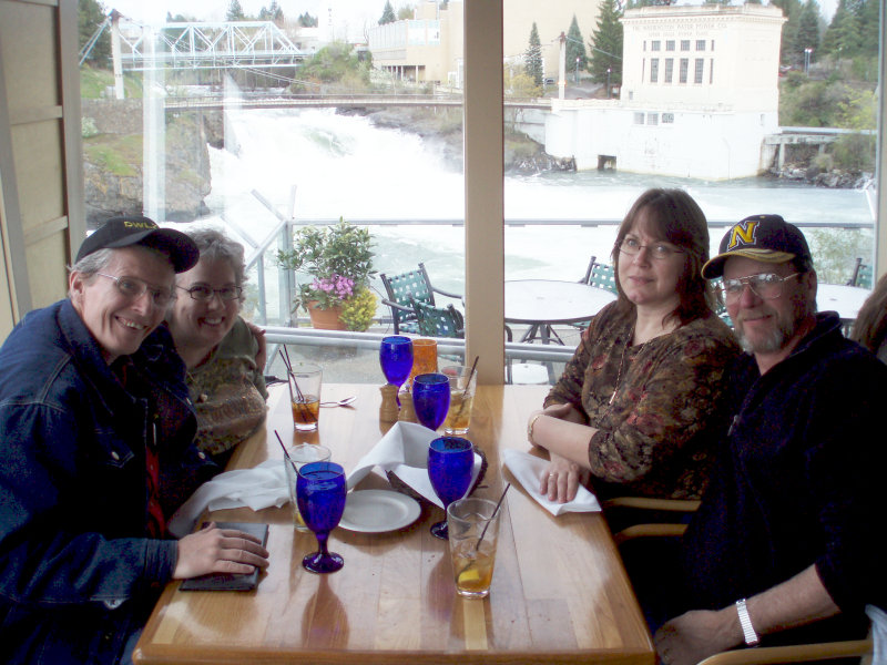 Right after asking if we wanted dessert, the waiter offered to take our picture. So, here we are again all together, but this time with the beautiful Spokane Falls in the background.