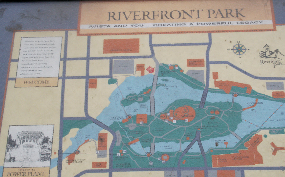 The road that I came in on is not shown on this map, but I entered the area of the map at the bottom left coming in where the large orange circle, representing the carousel is shown. The fountain is there and a bridge that I crossed over. I wandered to the Pavilion, where the IMAX Theater is located and little carnival. I crossed a bridge to the far side of the river and made my way up to the Diversion Dam. I think made my way back, stopping at the old Railroad tower, near the bridge and just across the water from the Carousel . I visited the island to the left and top, where a bit of rocky land juts out up steam, and is called Inspiration Point. Two bridges connect to the other end of that island and I walked across them both. I finally crossed over the large bridge to the left and walked past the Lower Falls on the far side of the Spokane River, and got up underneath the last bridge on the left to view the falls. From there I walked back to the bridge just above the Lower Falls and made my way back to the hotel.