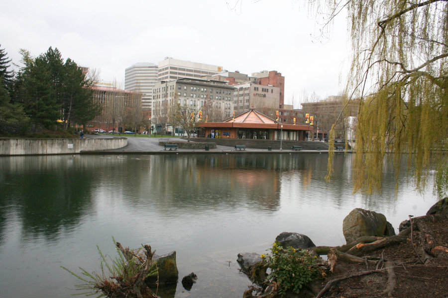 The Riverfront Park is a very beautiful part of downtown Spokane. The carousel across the water is early twentieth century construction, though the building housing it is much newer. Our hotel is not visible but it is in this general direction. I walked past Macy's on the way in, and the fountain I first encountered is just visible on the right. But the water steals the show. Even with the gray skies, the reflective pool is just gorgeous.