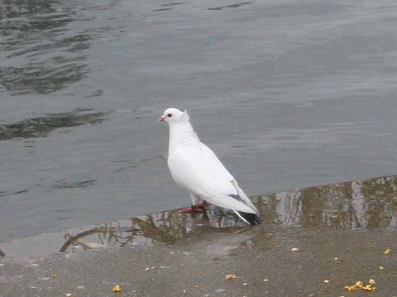 Another bird beside the water. It walked like a pigeon, and had other similar characteristics, so it may be that is what it is. But its white color was a little confusing. (Albino?)