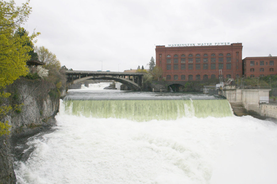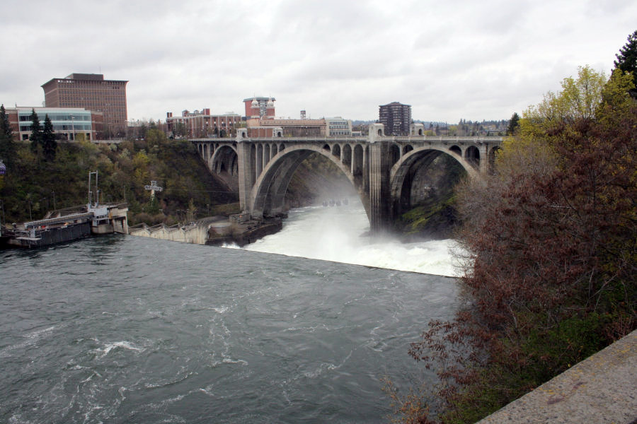 I am standing on the Post Street Bridge. Off in the distance is my final goal for my walk this morning: the Monroe Street Bridge. The Lower Falls are just ahead, and it is throwing water high into the air. The gondolas are not running yet, but some of the cars are fixed in place over the water. The end point turnaround is located just behind the support leg of the bridge at mid picture. I would be working my way down the right (north) bank of the river to reach the bridge.