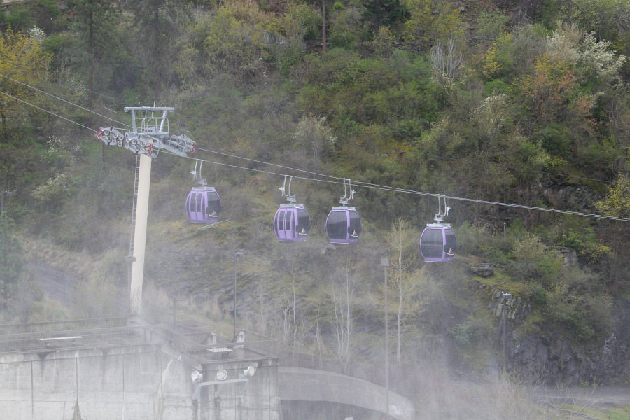 It soon became clear that it wasn't going to become clear for our trip. It was raining and the windows were streaked, but we still had a lot of fun. Through the streaks and running drops of water, the course of the gondolas is pretty easy to trace, all the way from this turn around point all the way across the river and up the hill. Once you clear the hill, there is just a short run down to the starting/ending point.