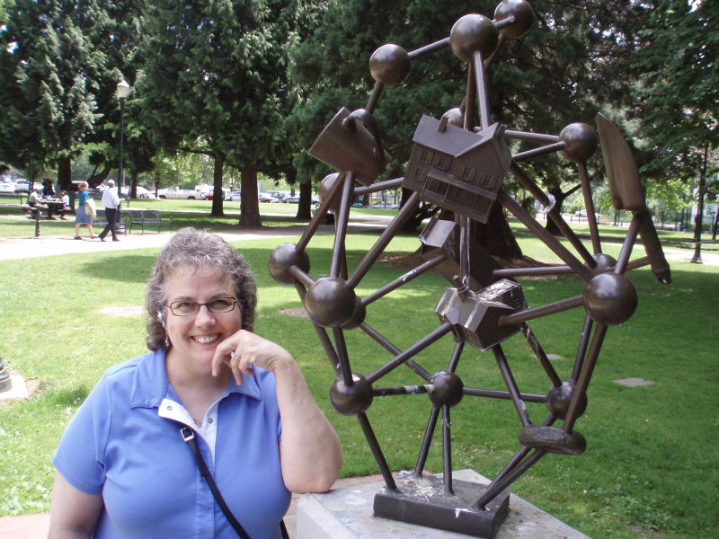 When the MAX train dropped us off at the Lloyd's Center Station we cut across the park to get back to our car in the mall parking lot, where we could drop off the backpack, before heading into the mall itself. We spotted this sculpture as we were crossing and Dotti was kind enough to pose in front of it.