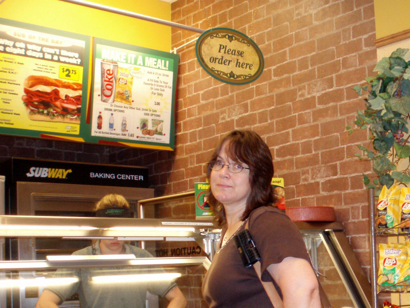 Of course food had to enter in somewhere during our visit to the mall, and we made two food stops along the way. Both of them really were "OP stops" because they did not push our point totals up too high. We visited Subway for some sandwiches and here Dotti, Jim, and Tammy are in line. (Yes, I am spoiled. I admit it. ☺ Dotti always waits in line and gets our food while I find and save a table for us.)Dotti already has her order all ready in her mind, and has turned around to smile her lovely smile at me, while Jim and Tammy are studying the menu.