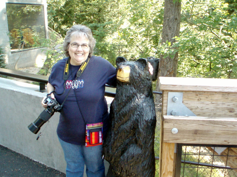 Once we made it across the bridge, Dotti found a friendly bear to pose beside. He tried his best to appear natural, but I think he looked a bit wooden. (Groan.)