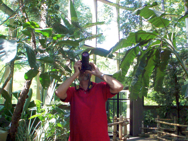 Jim is already looking natural with the Nikon, while shooting a picture in the Vollum Aviary, located on the edge of the Africa section of the zoo. These aviaries make it easy to view exotic birds up close, without having to hunt far and wide to see them. After coming out of the Alaska Tundra section, with the icy and appearing displays, the sultry atmosphere in this building was quite a contrast.