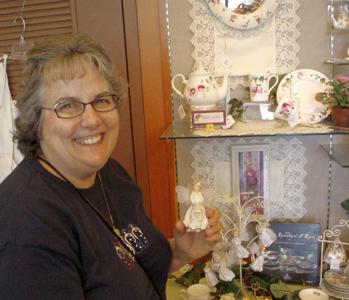 After going down a set of stairs from the station, we came upon a gift shop. Here is Dotti holding an angel she found. (You can see my fingers and camera in the mirror at the top of the picture.)