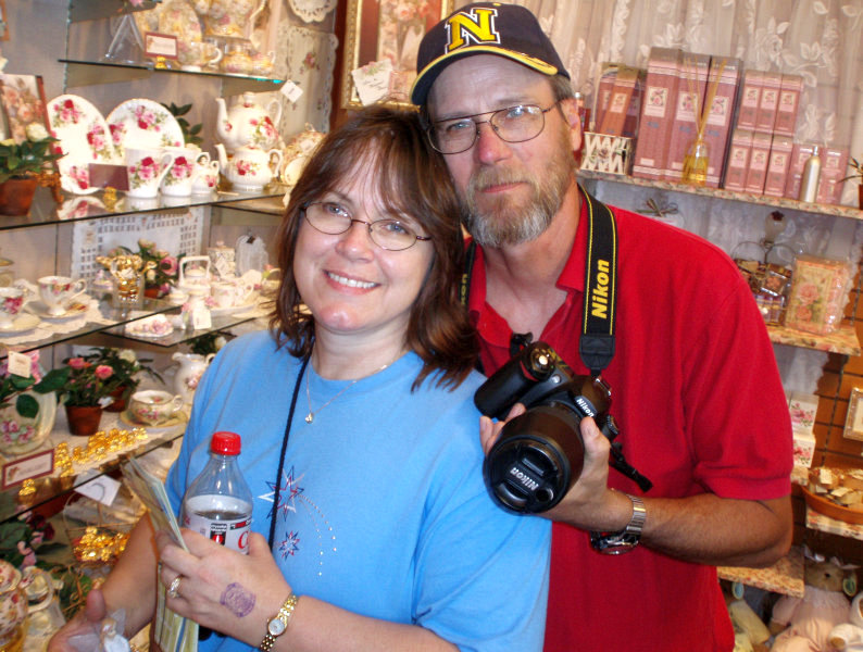 Here is romantic shot of Tammy and Jim in the gift shop. Tammy is sporting the hand stamp that we got at the train station, and Jim is holding the camera tight. His Navy hat and the Nikon neck strap are nearly color coordinated.