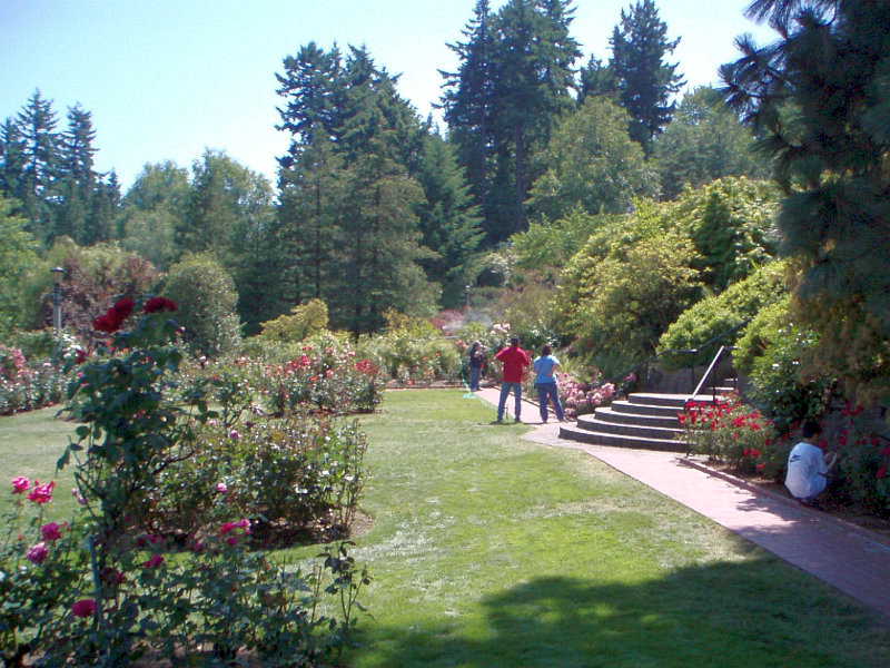 Here we have gone down some stairs and entered the Portland Rose Garden. Dotti has borrowed her camera back, because we have hit the flowers, and she loves to take pictures of flowers. Jim and Tammy look on, as Dotti clicks away. (When Dotti gets her photo album up from this event, I will put a link to it here.)