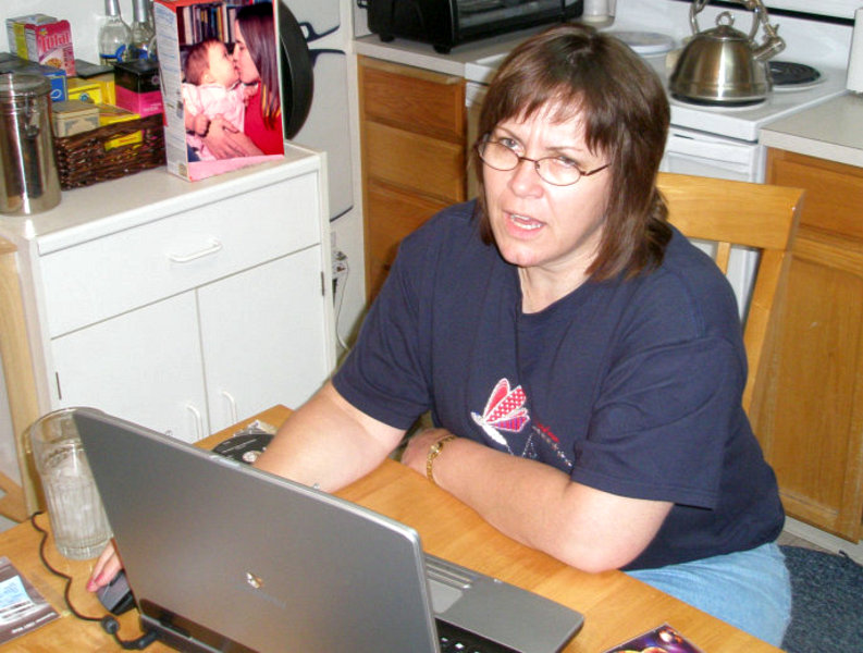 Friday night we did some things on the computer, and here is Tammy working on her laptop. (Pay no attention to the cereal box in the background that appears to have a 25 year old picture of Dotti on it. It is only your imagination.)