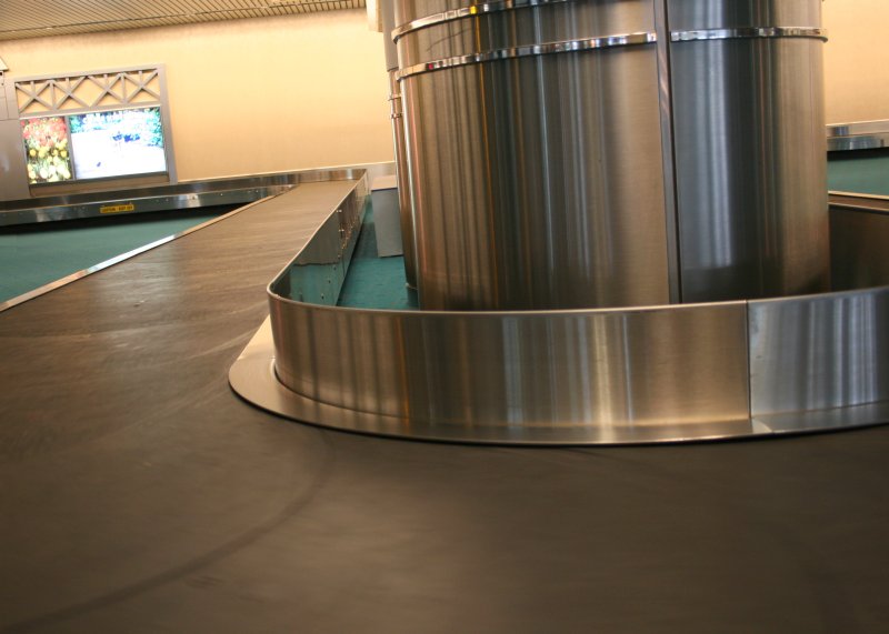 The luggage belt followed a course that conveyed the suitcases out of the wall, all of the way out to the end of the island, back to the wall again, and then around another identical island before returning into the wall, to be cycled around again. This provided a large amount of "surface area" for the passengers to stand around while awaiting the arrival of their luggage. We are actually looking at the second island—the luggage would be moving from left to right in this picture—and there were no passengers in view here. As is usually the case, the passengers were massing up over at the first stretch of the belt, impatiently waiting for a glimpse of their baggage as soon as possible, making this a desserted island for the moment.