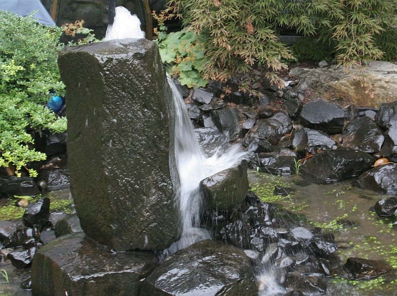 The garden was surround on three sides by the hotel, and on the forth side was this rock wall, which had water pumped to the top of it, to create a very nice waterfall effect all along it. The water actually flowed over both sides of the wall, even though only one side is visible here.