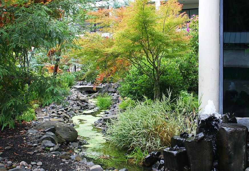 On the right is another fountain, and once its water flowed down to the ground level, it formed a little stream that ran along the rock-sided bed, and under the footbridge in the distance. The trees almost make the hotel room balconies invisible in the background.