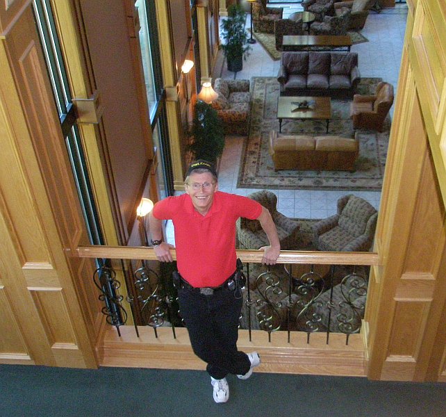Dotti took this picture of me, looking down from the third flood at me, standing on the second floor, with the Great Room behind me on the first floor. At times the Great Room was empty, and even when there were some people there, you could have a lot of privacy with the spacing placed between the groups of chairs. Dotti and I spent some very relaxing time here, reading and visiting.