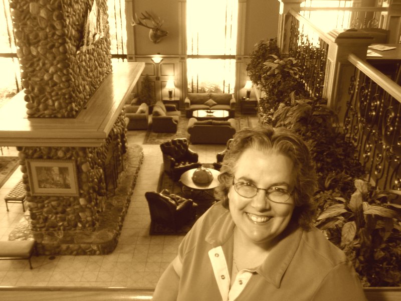 Once again inside, I took this picture of Dotti from the second floor balcony. After your eye moves past her dazzling smile, it will find the very large rock chimney, which houses a very interesting fire place. There is a cutout in the stone where logs over 3 feet in length can be, and are, stored. But that is all just for show, because the fire is all gas fed. Still, it is pleasant to sit in the overstuffed chairs surrounding the antique globe of the world, and gaze into the flame. Even though it was summer time, the room was kept cool enough to where we could enjoy the fireplace.