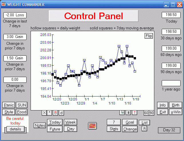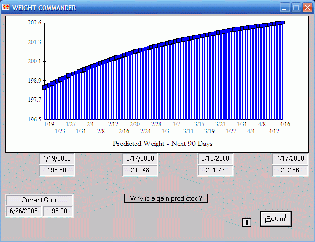 The Weight Commander Future graph is even more surprising, because it shows me doing a lot better than it did last week. If you recall, I was going to be up around 213 by that prediction. Now at least it is only about 202.5. Still, I do need to get that graph moving towards a number inside my target range.