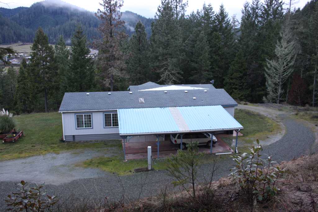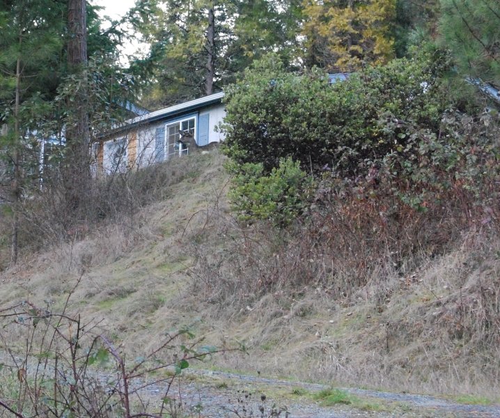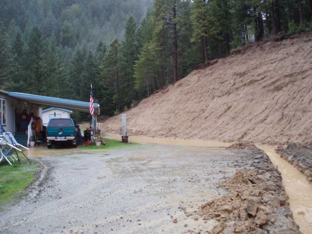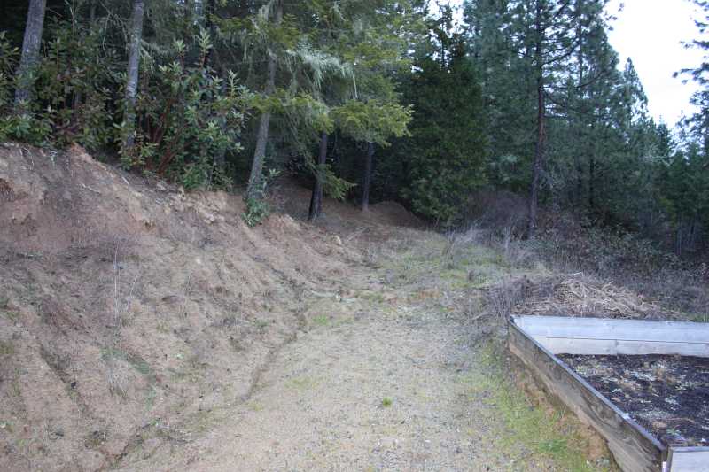 I knew of one negative aspect of the property that we were going to have to deal with: the dirt bank. In order to fit the modular home on the site, they had to widen the flat area by cutting away the bank. When Mom and Dad lived here, it was just a single wide trailor that they had moved up, and the bank was still vegetated, with a gradule slope down the hill to their drive way. But there was no room for a big unit like is there now. (I took this picture of the bank back on Christmas Day in 2005, when a drain pipe had backed up and a flood was in the making at the property. The renters called up as we were celebrating Christmas morning and we had to drop and run up to see what could be done. Mom knew a local guy with a backhoe who graciously came up and cut the trench you see on the right. Later a large drain pipe was laid so this wouldn't happen again.)You can see that Mom's husband never did anything to slow erostion of the bank, and with the amount of rain that Oregon gets, that was unfortunate. Still, with some grass and other plants in place, the errosion could be drastically slowed. One of our first priorities was going to be to take care of that!