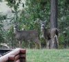 Dotti looked up about then, and 15 or 20 feet above us, looking down from the front yard of the house, stood three silent deer. I stopped while Dotti grabbed her camera and started shooting pictures. She was in seventh heaven! We were being quiet so as to not scare the deer when Mom arrived behind us and honked her horn. It showed that we hadn't of needed to be quiet because the horn did nothing to spook the deer. We drove up to the house and the deer were still there, although they left soon after that.
