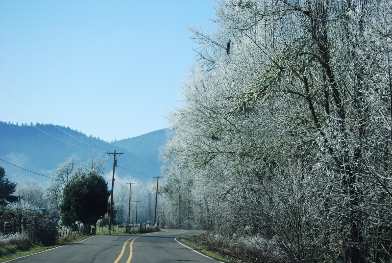 The road back to civization from Mom's place was nicely decorated in a white frosty coat. It seemed every way we turned to look there was another new scene of sunlight reflecting off of, or merely shining through ice crystals.