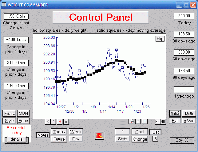 Looking at the Weight Commander graph for this week, after the black boxes hit the top of my limit, they drifted downward in a sort of stair step. The white squares bounce around this way and that, but the trend appears to be downward. That intuitively seems very odd. I have been eating at restaurants and coming up with high point days too often, and yet I appear to be working downwards on the scale. That is why I weigh every day, because other wise I would assume thing are different than they actually are.