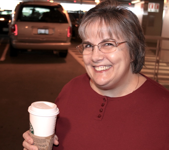 After stopping at Starbucks for some coffee, we made our way to the airport and parked in the Short Term Parking lot. Dotti looks so pretty with her beautiful smile in full bloom. She, like I, was feeling the excitement as our Jamie and Hunter were about to arrive!