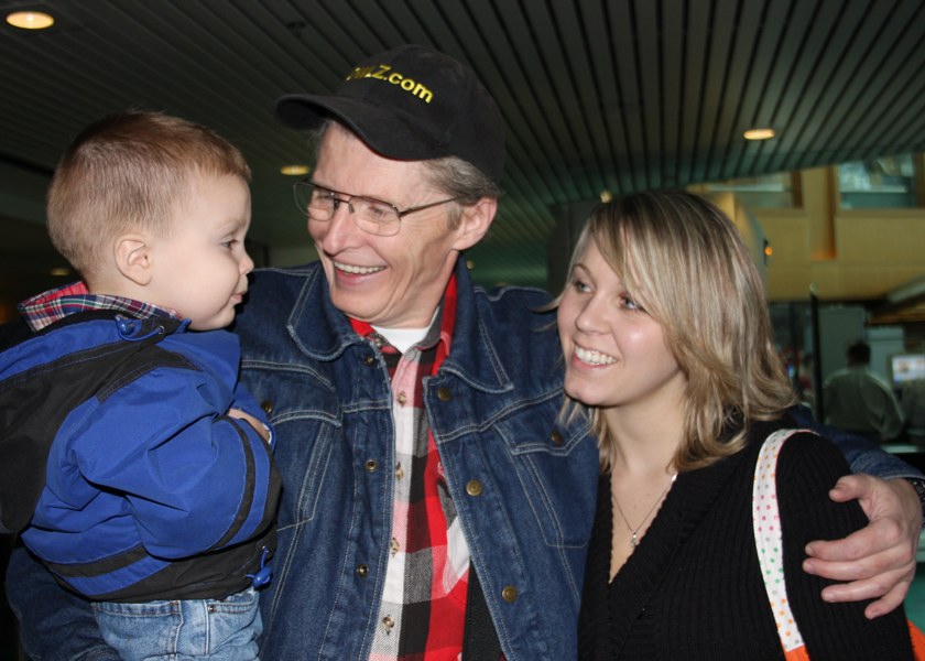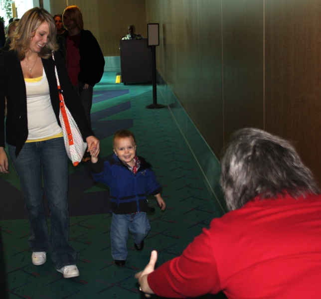 Soon our waiting was over and here they came past the security check point, with big smiles on. Hunter was walking really well (and running well too, I later learned) and talking up a storm. Jamie, as always was the perfect attentive mother, and a pleasure to have with us. Our house is brightened up every time she has visited us, and now Hunter has added his own wonderful sunshine that he carries with him everywhere. Dotti was reaching out and looking for her first of many hugs from our Grandson over the upcoming visit.