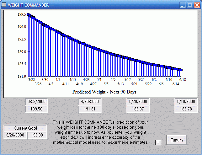 The future graph really looks good this time around. It predicts that I will be below my old target weight of 185.0 by the time my lovely bride and I celebrate our 32nd anniversary. It is unlikely that I will be there at that time, but at least it is not showing an upwards trend!