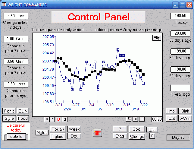 Weight Commander graph this week shows that I am headed in the right direction, with the solid square trend heading towards my target range of 195 to 200.
