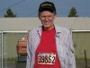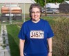 | Here's Dotti, smiling and wearing her walking outfit, sporting her official Bloomsday "bib" displaying her "bib number" of 34520. (If you click on the photo at the top of the Bloomsday Finisher teeshirt, you will be taken to a page where you can enter in the bib number of a finisher and get the stats for that runner/walker.) The sky was blue and the sky was out as you can see. At the time it was still quite cool out, but later on, especially during the race, that sun felt plenty warm.