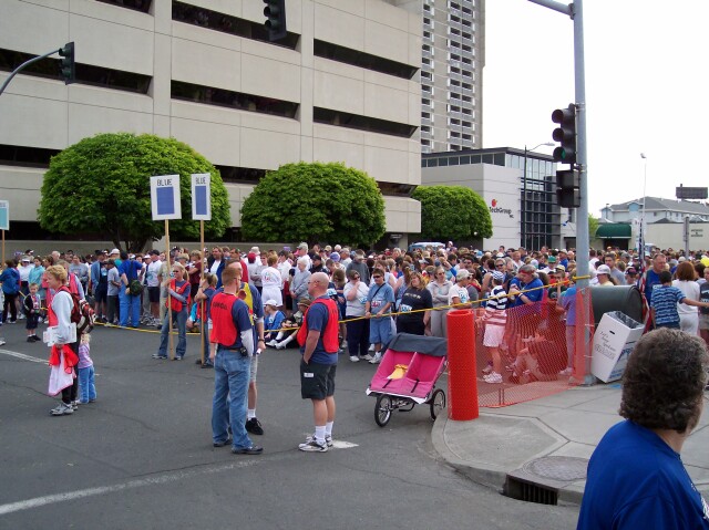 And this is the view looking forward towards the starting point. We actually didn't reach the starting line until we turned the corner at the signal lights that stood beyond the American flag in the center of the picture. After making that turn, we had to go one block to the left, and the we turned right and that was where the starting line actually was. They were announcing the amount of elapsed time that had passed since our group started as we approached the start line. From the time the clock started for our group, it took me just over 5 minutes and 50 seconds to get to the starting line (at the intersection of Stevens and Riverside), where my official time could start. For Dotti, Tammy, Jim and Jamie it was well over 6 minutes.
