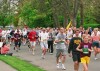 This is the Green group as they are getting under way. When our group started, at first it was hardly moving at all. Then you could feel a bit of a rush begin as the crowd began to pick up speed. Still there were very few people who could start jogging yet. In fact, even though most of the way I was merely speed walking, I found that I had to move back and forth across the road to find a path to walk without running into someone ahead of me. Often I would have to go onto the shoulder of the road, or the sidewalk to find a clear path. Dotti, Tammy, Jim and Jamie actually came to a halt at one point because at bottle neck in the course there was a deer standing on the hill beside the road and people were stopping to look at it.