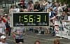 When we purchased this picture and I was quite disappointed, because it was cropped right down the middle of my body on the right side. However, when we discussed the problem with them, they sent a new picture that was cropped correctly and they included a close up of me free of charge! There I am in my blue jeans, red tee-shirt, with my long-sleeved shirt tied around my neck. The clock says 1 hour 56 minutes 31 seconds. My stop watch said 1 hour 35 minutes 35 seconds. From that, since we know that the clock started at 09:00, we can calculate that I hit the starting line at 09:20:56, after waiting 15 minutes until my group started at 09:15, and then taking another 5 minutes and 56 seconds to reach the starting line. That was within a few seconds of what I would have come up with for a time using the time called out as we approached the starting line. However, I was happiest that I had completed the race, and just followed the crowd to the tee-shirt pick up point.