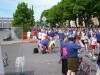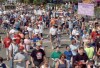 At several points along the route, they had water stations like this one, where paper cups filled with water were available. People would grab a cup or two and pour the water inside and/or outside to quench their thirst and cool off. Once the water was gone from the cups they all found their way to the road surface, and being a bit slick, they made the road surface a little tricky to walk on.