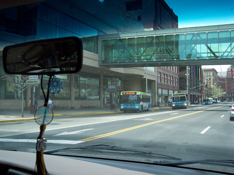 This is the faster contingent of racing team this year, and all proudly wearing their well-earned Bloomsday Finisher tee-shirts. We had gone though a bit to get here. First off, we were too late to catch the express bus back to the Mall where our car was parked. So, we had to go to the main station. Misty was our trusty guide, because she knows everything about the Spokane bus system. She knew where the main station was, and exactly when the next bus was due to arrive. Once we got there, there was a wait of about 20 minutes or so for a bus to arrive. Sadly, it wasn't any significant amount warmer than it had been before the race. Once again we were chilled to the bone. (Dotti and I took 2 or 3 days before we actually felt fully warm again.) It was good to finally get on the bus and get out of the cold weather outside. |