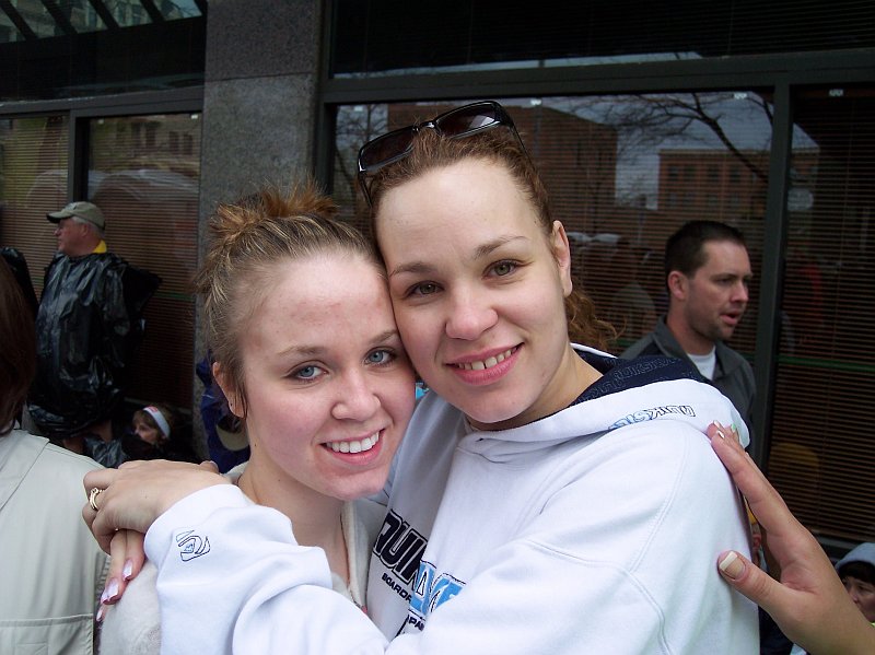 RACE DAY! Dotti and Tammy have their smiles, as well as their "bib numbers," on display for the race. Soon we would be heading over to the shopping mall, where we would leave the van and catch a bus downtown for the race. |