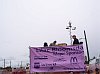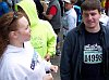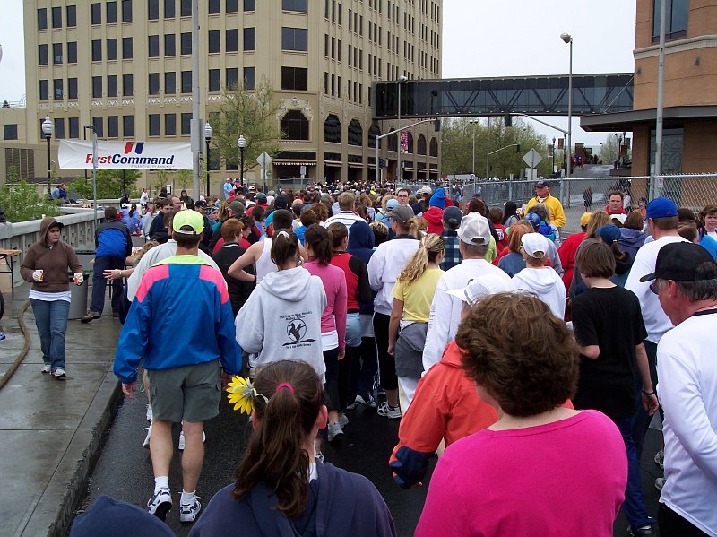 Got Chip? They tried to be creative with their signs to get your attention and remind you to drop your chip off. (Your official time was on it, so you wouldn't get recorded if you didn't drop it off.) We are near the other end of the bridge here, and we see that the line ahead takes a sharp turn to the left. The open space between the people was about to disappear as we pressed in to get our tee-shirts. |