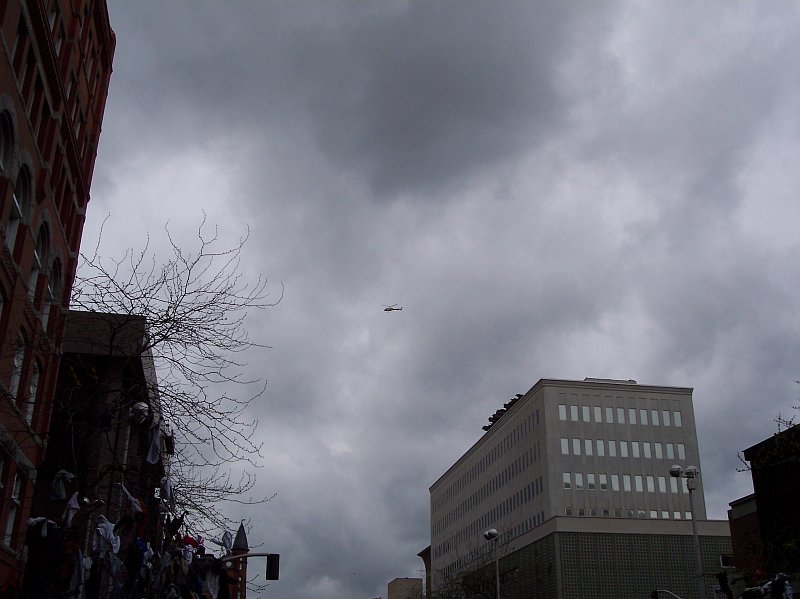Looking forwards towards the starting line. The crowd is densely packed, and looking at how the people are dressed, you can tell there was quite a chill in the air. Considering that a 7.46 mile race was before them, there were still a lot of coats, sweatshirts and rain parkas visible. Looking into the trees, we could see that the tradition of throwing your windbreaker or sweatshirt into the branches before the start of the race was still going on, but at a decreased rate from normal. We also saw some people snagging the discarded garments for their own use because of the cold! The port-a-potties on the left got a real workout before the race started because no one wanted to have to stop along the way to use them. The lines for the race course facilities are always backed up, and it takes a long time to use them. Naturally all of that time goes against your clock. The light at Stevens Street eerily cycled through green, orange, and red, with no significance whatsoever. Off in the distance, the Howard street signal was doing the same. The clouds showed no signs of clearing and race time was approaching. |