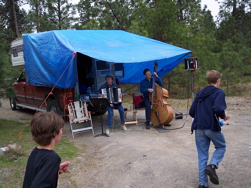 The ladies in the foreground appear to have their stride working well. In the background we see that the young guys are in under the tent, and out of the rain, but the older guy is outside playing his electric guitar, and getting wet. Things that make you say, "Hmmm." |