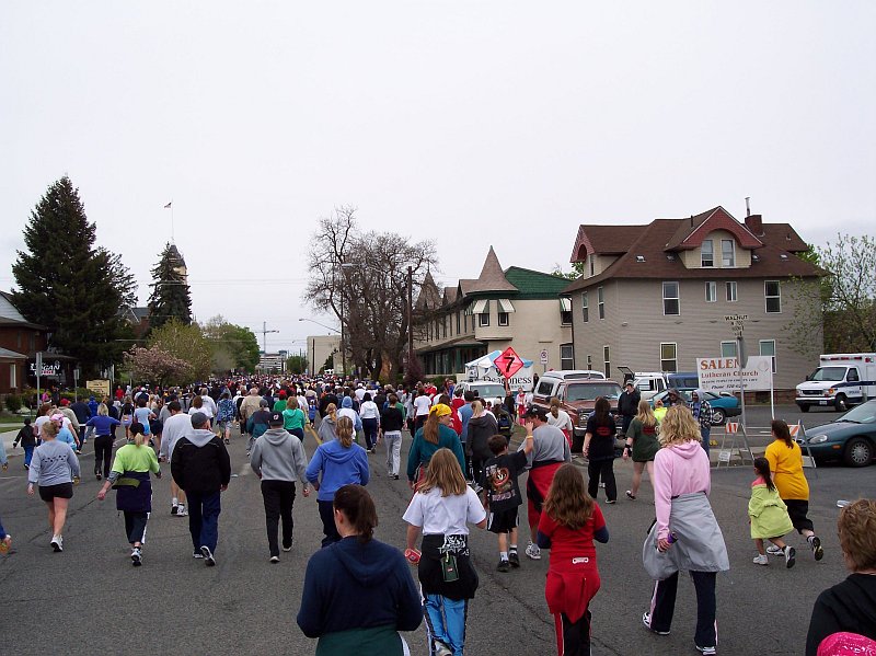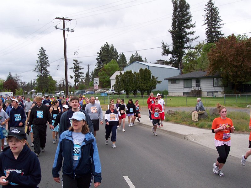 This is Hangman Creek (also commonly called Latah Creek) and after descending from 1900 feet above sea level down to about 1775 feet on the 5.3% slope of its valley wall on one side, it was time to ascend on the other. We were approaching the 2 mile mark, and getting ready to leave Riverside Avenue for good. So far it had all been downhill. But all of that was about to change. For the next 2.5 miles we would be reclaiming most of the lost elevation, all the way to around 1880 feet or so. A bit of history: The official name of the Creek is Hangman, not Latah. The Indian word "latah" meant "fish" and, as with most Pacific Northwest creeks and rivers, there are plenty of the slippery little guys in this creek. The name "Hangman" is earned rightly enough. During the hostilities between the white man and the Indian, a group of Palouse Indians attacked a group of American soldiers and inflicted heavy casualties. The soldiers took a very dim view of this, in light of the fact that they felt they had done nothing to provoked it. Colonel Edward Steptoe, who commanded the attacked regiment, rounded up the Indian perpetrators and hanged 27 of them, earning himself the nickname "hangman." Later his nickname was attached to this creek. The county tried to have the name changed in 1997 to Latah, but the US Board of Geographic Names would have none of it. So, Hangman Creek it remains (despite what the official Bloomsday Route Map calls itJ). |