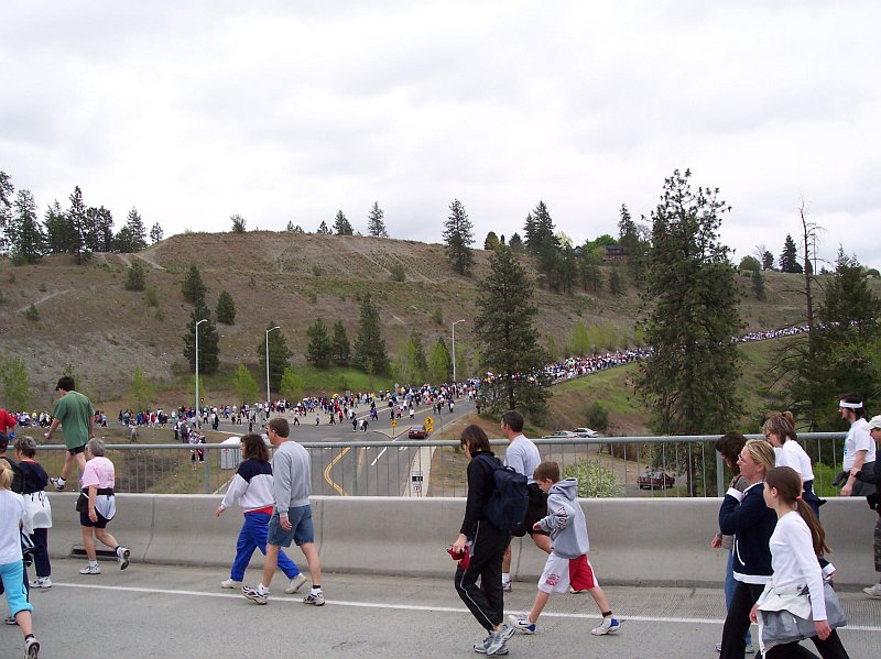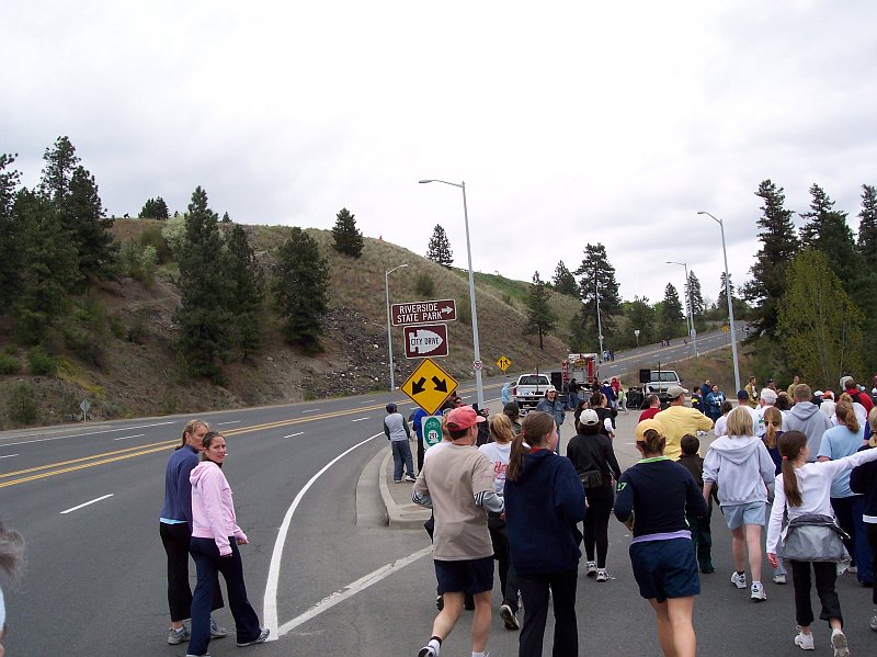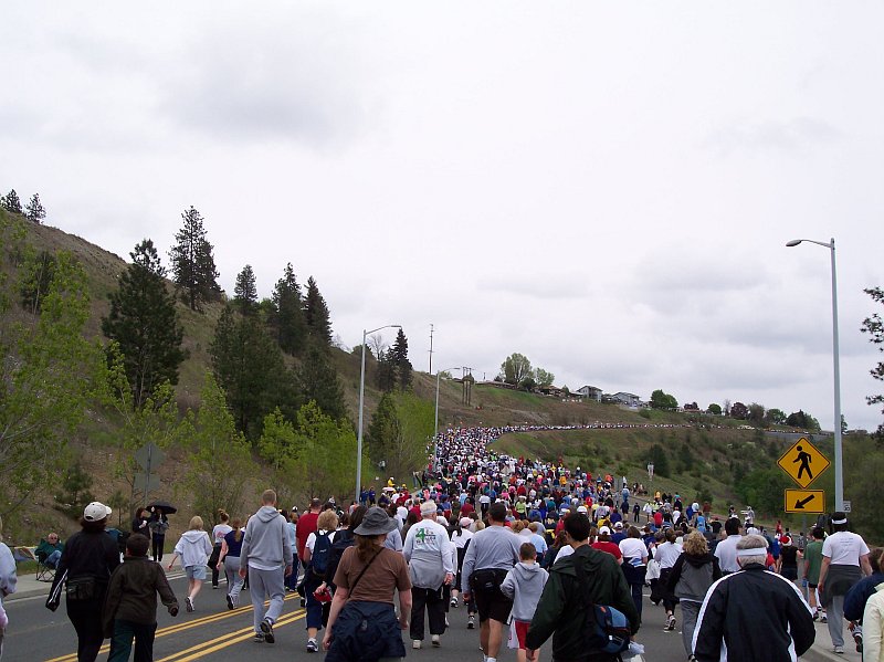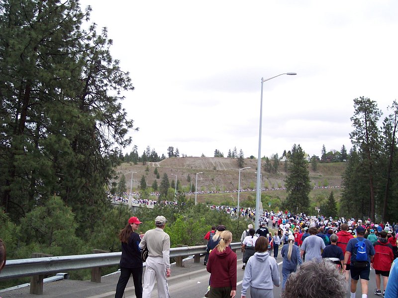 Here we are just about at the bottom of Doomsday. We just have to cross the Spokane River, on the T. J. Meenach Bridge, and we will engage the hill. LeRoy was still with us here, but he was soon to head off in search of Jim and Tammy. Dotti had long ago removed my flannel shirt that she had been using for some extra warmth, and I had put it on under my coat, because I was still feeling cold. It was about here, that I finally warmed up enough to take the flannel shirt back off and rely only on my raincoat. There is a guy just ahead of us in a gray tee-shirt who is showing some sweat, so things are starting to warm up. However, the air temperature really wasn't much different than it was at the start of the race. And many people who are taking a more leisurely pace are still in long sleeves. |