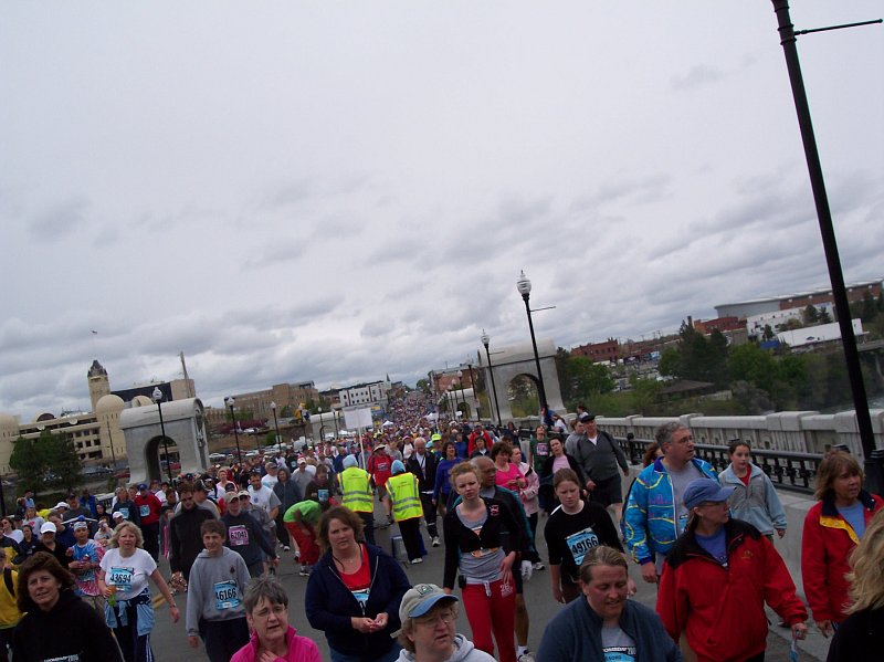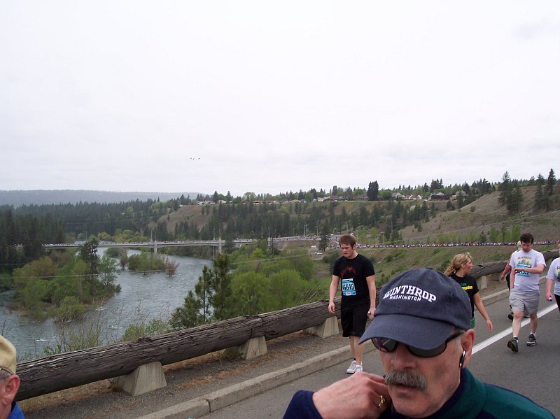 Crossing the Spokane River on the T. J. Meenach Bridge. The water that we see below us is headed for our place. It will flow down the Spokane River until it reaches the confluence with the Columbia River. Then it will flow to the Grand Coulee Dam, through its generators, and then south through central Washington, all the way to the Tri-Cities area, where it takes a sharp right and cuts through the Cascade Mountains in the Columbia River Gorge. Hopefully it will wave as it passes us in Vancouver. Off in the background you can see those who were ahead of us and already locked in combat with Doomsday. |