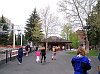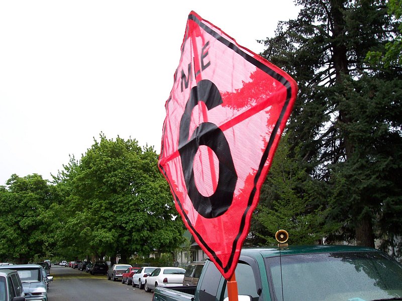 Meenach Drive continues on up the hill, but we follow the signs to Riverside State Park. The pickup trucks in the background are in support of a band playing on, encouraging the racers to make it to the finish. |