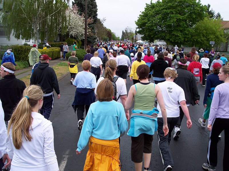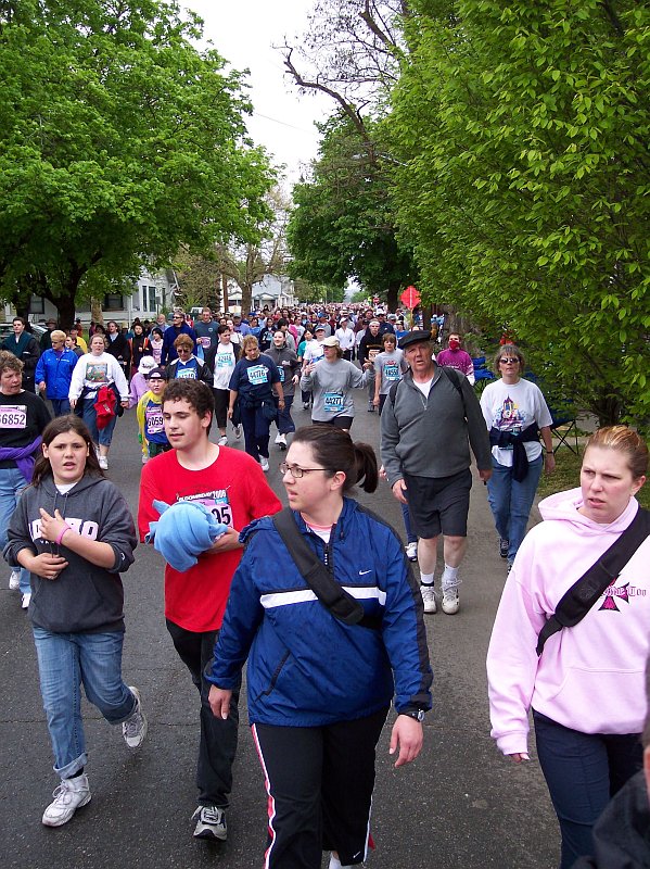 Every so often, Dotti would take off on a quick jog, to break free of a clump of people blocking our way, and to land us into a relatively clear zone. We had just gone through one of those maneuvers, and I snapped a picture with the camera facing to the rear. There was LeRoy right behind us. (He didn't join in the jogs, because he could catch up quickly by just walking, and he could still retain his cool image. J) We didn't get a chance to look backwards as LeRoy very often, and later on he moved forward to walk with his "second set of parents" to finish the race well before we did. |