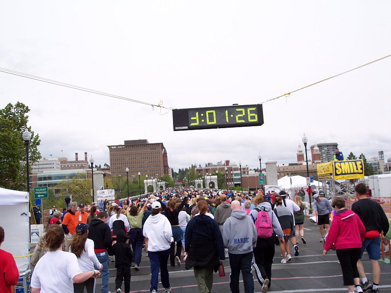 Thirty years ago, the residents of Spokane saw their very first Bloomsday Race. At the same time, Dotti and I had planned to get married in early May, and my leave was approved, so I could fly home from Diego Garcia, in the middle of the Indian Ocean. But, as all too often happens to the military man, the Navy canceled my leave, and all of our plans evaporated into smoke. Our church wedding was gone. In typical Dotti fashion, her wedding dress had been loaned out, since she wouldn't be needing it, and we were very depressed. Then all at once my leave was reinstated, and I arrived home just a bit later than we had hoped. But there was no putting the genie back into the bottle. The church wedding was gone, there was no time to reschedule. And Dotti couldn't get her dress back. (Her brother's wife had had it altered and she wore it 9 days after Dotti and I were married, in their church wedding. At least they are still married too. J) So, on June 10th, 1976 we drove over the Interstate Bridge from Portland to Vancouver, Washington, because Washington had no waiting period for getting married; we bought a marriage license at the courthouse, and walked across the street to a little wedding chapel (that has since become a Bail Bond Shop) and were married: no tux, no wedding dress, and no frills. Inauspicious, you might say, but that humble beginning has carried us through 30 wonderful years. So, 2006 not only marked the 30th anniversary of the first Bloomsday Race, but it brings Dotti and I to our 30th wedding anniversary as well. But it doesn't end there! Eight months after the first Bloomsday was run, our dear friends Jim and Tammy said their vows on New Year's Day 1977. Before another Bloomsday will be run, they, like us, will have been married 30 years. So, this was indeed the 30th Anniversary Bloomsday Race, at least from where we stand. It was 51° and it felt cold! Dotti and I still felt chilled for a couple of days even after the Bloomsday Race had been run this year. Dotti and I have walked in much colder weather (e.g. 24º at Pocatello on February 7, 2005) than what we saw during the race, but we spent a lot of time standing around in the cold beforehand. Also, if you dress for standing around in a particular temperature, you are going to be roasting when you start walking, and after 7.5 miles, you will be really overheated. So, we were underdressed for the temperature we had to face. But it was still a wonderful event, and we are very happy that we were able to do it! This was my third time for doing the race and it was Dotti’s second. (Unfortunately, in 2005, while Dotti was actually there for the event, she had an injured knee, and she was unable to participate.) The cold damp weather held down the participation for the race this year, and while the number of people doing it was over 44,000, that was far less than the over 50,000 that did the last one that Dotti and I participated in together in 2004. It was one of those kinds of days that would be perfect if you were running to set a personal best record. However, if you were walking a slower pace, it was cold enough, and damp enough to make you uncomfortable. |