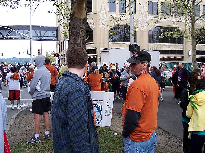 After picking up our packet, we then would be able to spend some time in the vender area, where various running and health products would be on display. In 2004 that is where Dotti and I purchased our first set of blinking warning lights that we could clip on our clothes when we went walking after sundown, so we would be seen by any passing motorists. This year would be our son LeRoy's first time to do the race, and to visit the Bloomsday pre-race vending area. |