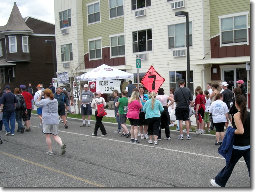It may be darkening and the skies might now be gray, but we are very happy to see the end of mile 7! The time is 12:21 pm.